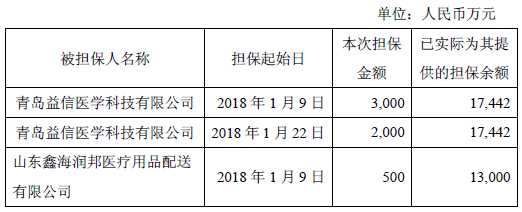 3、公司为山东鑫海润邦医疗用品配送有限公司在齐鲁银行股份有限公司青岛经济技术开发区支行开具的银行承兑汇票人民币1,000万元中的500万元提供连带责任保证。
